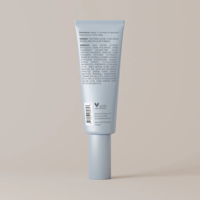 Aqua (Water), Glycerin, Beta-Glucan, Sodium Hyaluronate, Sodium Hyaluronate Crosspolymer, Sodium Acetylated Hyaluronate, Hydrolyzed Sodium Hyaluronate, Dipotassium Glycyrrhizate, Ceramide NP, Lactobacillus Ferment, Panthenol, Alpha-Glucan Oligosaccharide, Bisabolol, Sucrose Stearate, Xylitylglucoside, Anhydroxylitol, Hydrogenated Lecithin, Inulin, Xylitol, Arnica Montana Flower Extract, Madecassic Acid, Asiatic Acid, Maltodextrin, Hydrolyzed Gardenia Florida Extract, Dimethicone, Propanediol, Phenoxyethanol, Carbomer, Butylene Glycol, Caprylyl Glycol, Polyglyceryl-10 Stearate, Ethylhexylglycerin, Hexylene Glycol, Sodium Hydroxide, Sodium Phytate, Pentylene Glycol